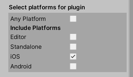 Assets/EazeGamesSDK/DLLfolder we have two sub foldersUNITY_DUMMYandUNITY_IPHONE. Those folders containEazeGamesSDK.dllforUnity editorandiOSrespectively. We need to make sure, that Unity didn't mess with platform selection for these dlls. Select eachdlland inInspectorview checkSelect platforms for pluginto be:- only